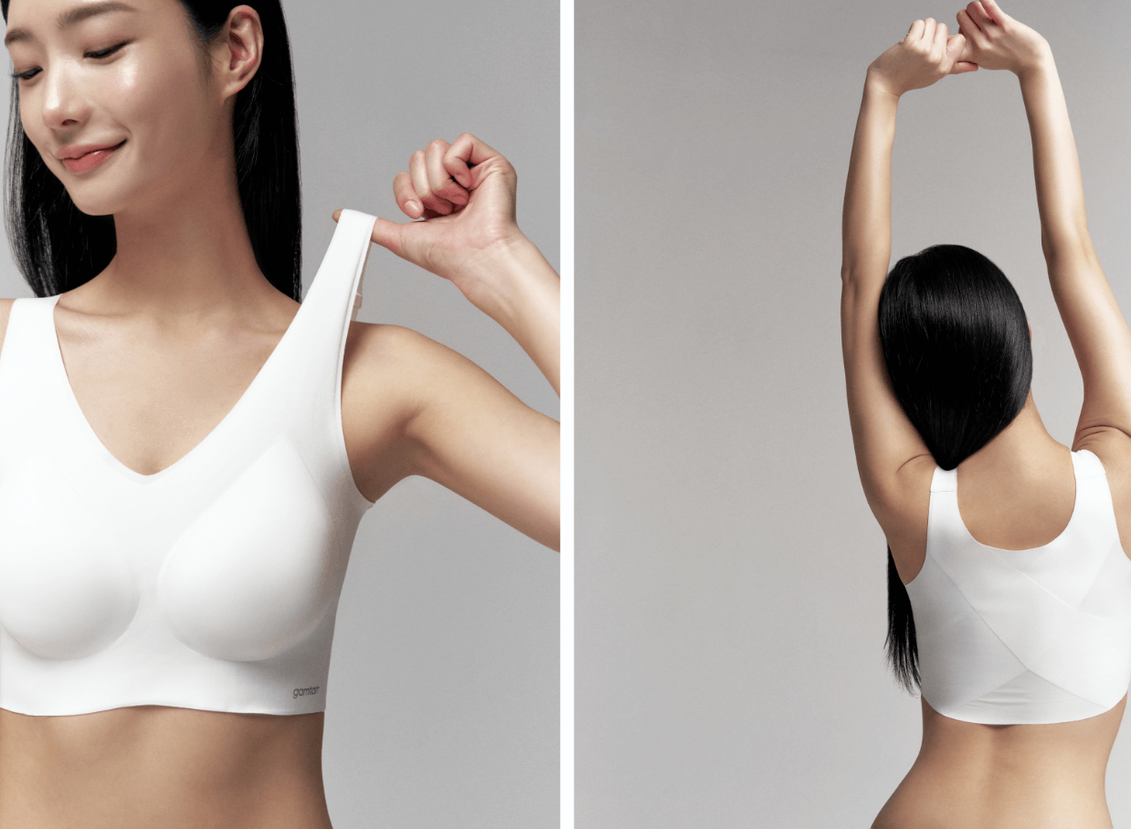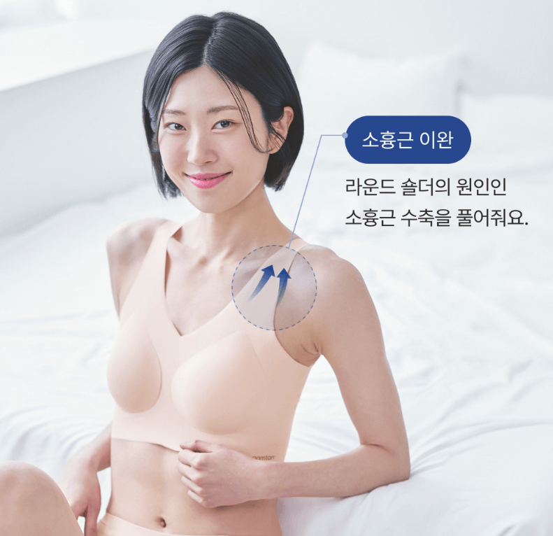 브라 안쪽에 X자 형태로 압력을 분산시키는 히든 구조가 있어서 어깨와 등을 살짝 당겨주는 구조예요. 덕분에 등을 펴고 가슴을 펴는 자세로 교정되기 시작해요.