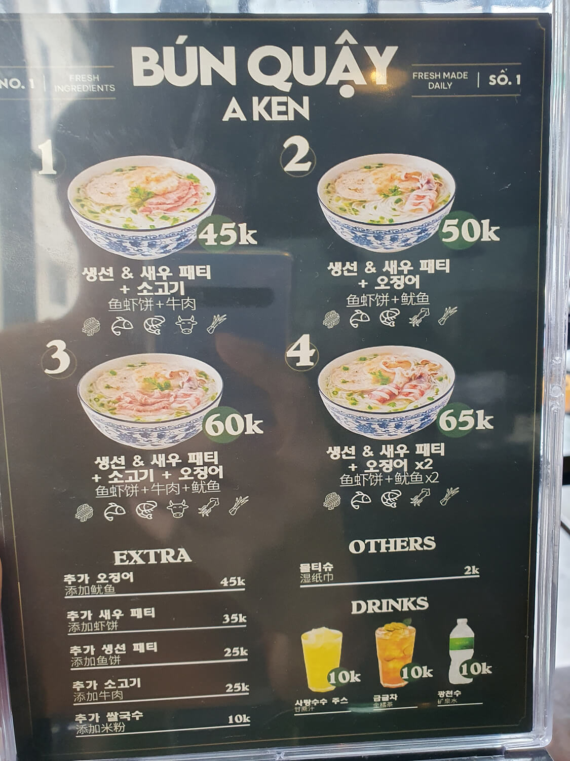 가게 앞에서 분짜 돼지고기를 그릴에 구을 때가 있는데, 그 냄새 한번 맡으면 그냥 못 지나칩니다. 한국어 메뉴판이 알아보기 쉽게 잘 되어 있어요.