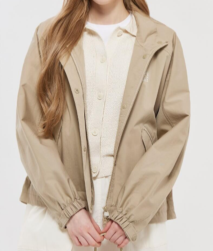 코튼 스트레치와 리사이클 나일론 혼방 소재로 만들어져 활동성도 좋고, 스타일링도 쉬운 아이템이에요. 카리나도 화보 속에서 자연스럽게 이 자켓을 레이어드해 착용했어요.