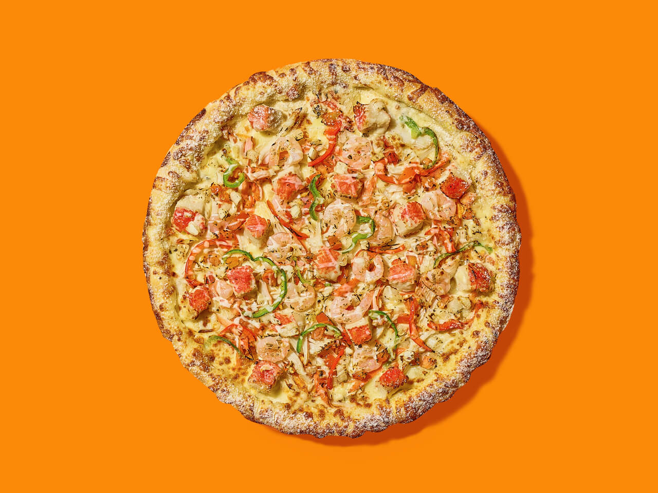 부드러운 화이트 크림 소스에 크래미, 새우까지 풍성하게 올라간 시푸드 피자예요.