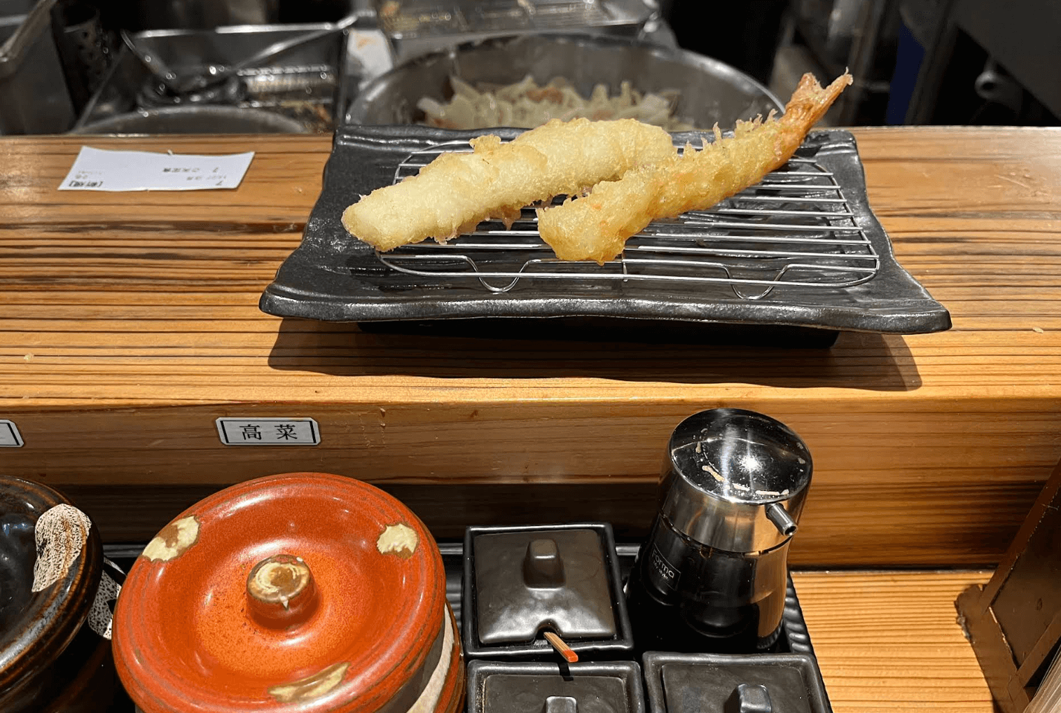 바삭바삭하게 튀겨진 새우, 오징어, 채소 튀김 등을 다양한 소금이나 소스에 찍어 먹는 재미가 쏠쏠한 식당이에요. 눈앞에서 맛있게 튀겨지는 튀김을 구경하는 재미도 있구요.