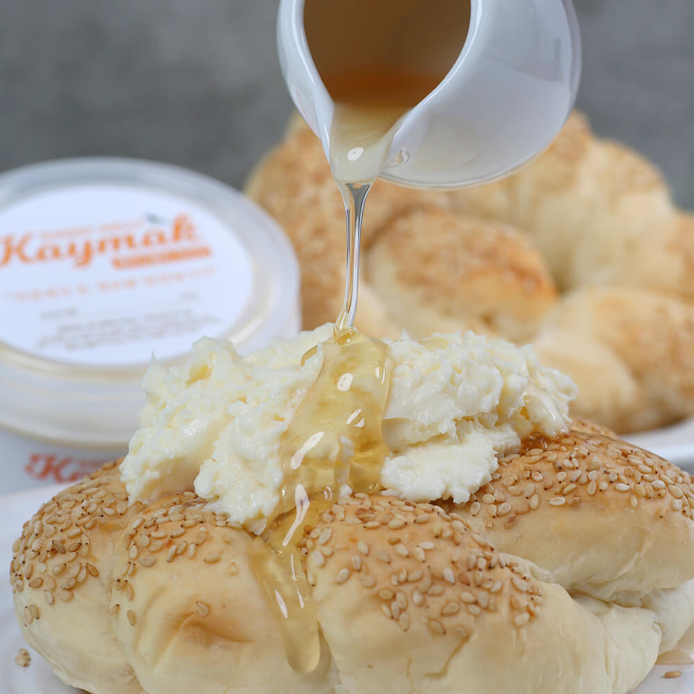 우유를 끓이면 나오는 지방층만을 모아서 굳혀 만든 유제품으로, 튀르키계 등지에서 즐겨먹는 디저트입니다. 부드럽고 크리미한 질감으로 고소한 맛이 부드럽게 입안에서 퍼지는 매력적인 디저트에요.