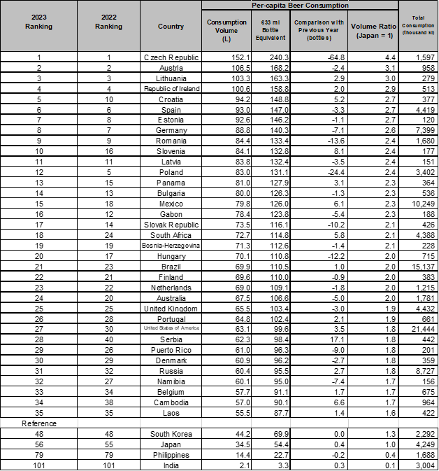 보고서에 따르면, 2023년 전 세계 맥주 소비량은 전년 대비 0.1% 증가하여 총 1억 8천 7백 9십만 KL (킬로리터)를 기록했다고 해요.