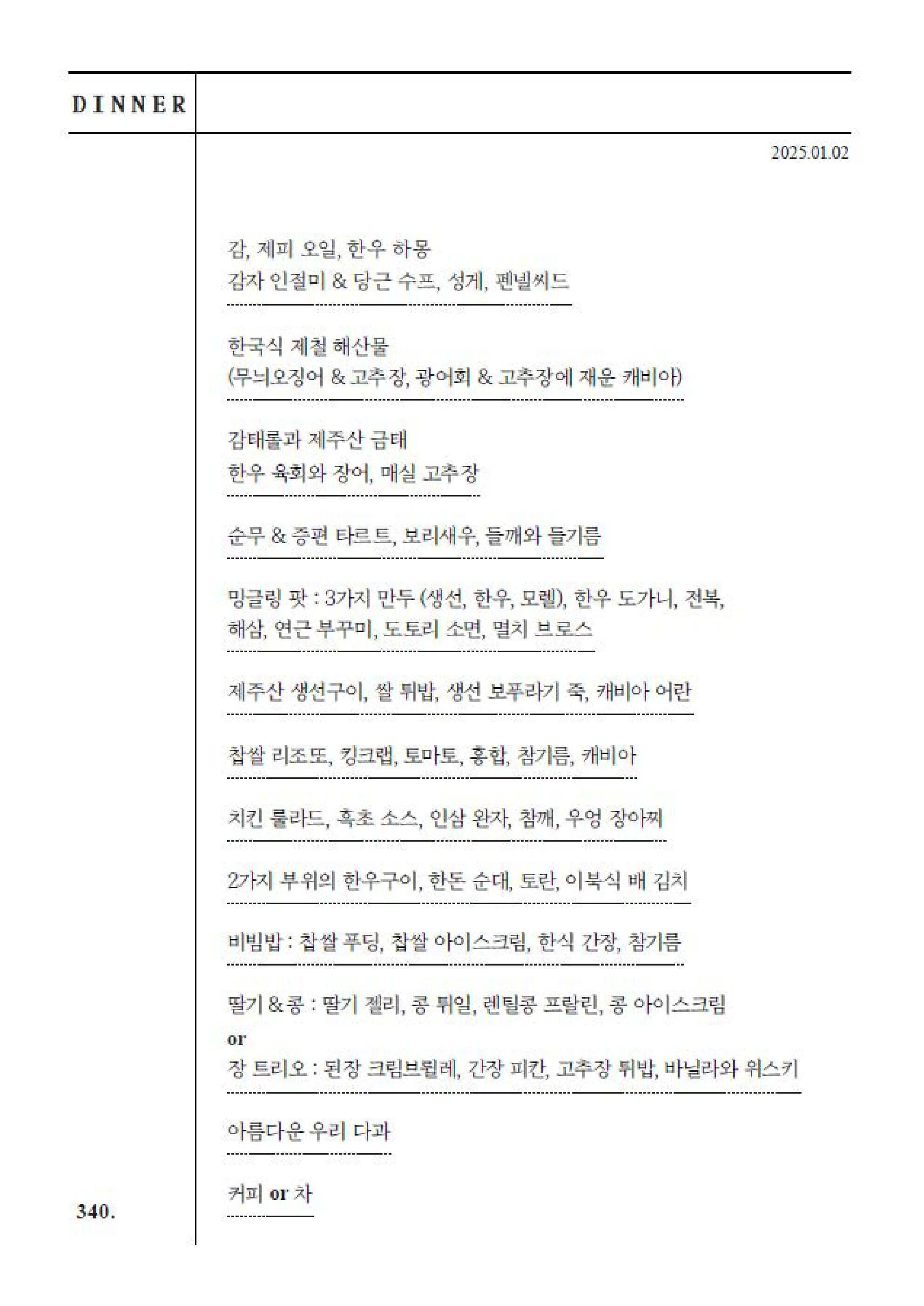 단일 코스로 구성되며, 메뉴는 재료에 따라 매일 조금씩 변동될 수 있어요.