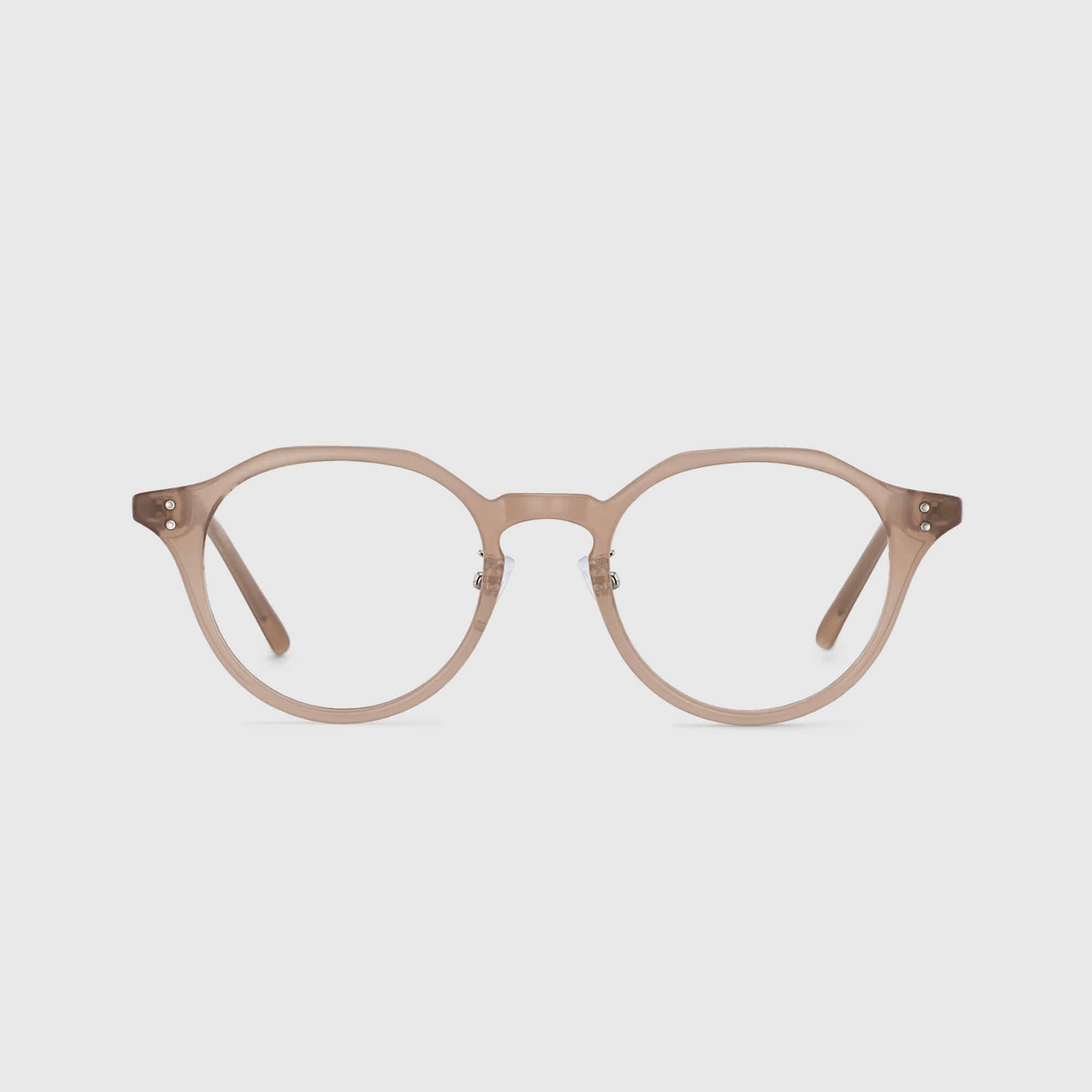 부드러운 누드톤의 라운드 프레임으로 각진 얼굴형이나 하트형 얼굴, 중간 톤 이상의 웜톤 피부에 잘 어울려요. 남녀 모두 착용 가능하지만 특히 여성스럽고 부드러운 분위기를 원하는 분들에게 추천합니다.