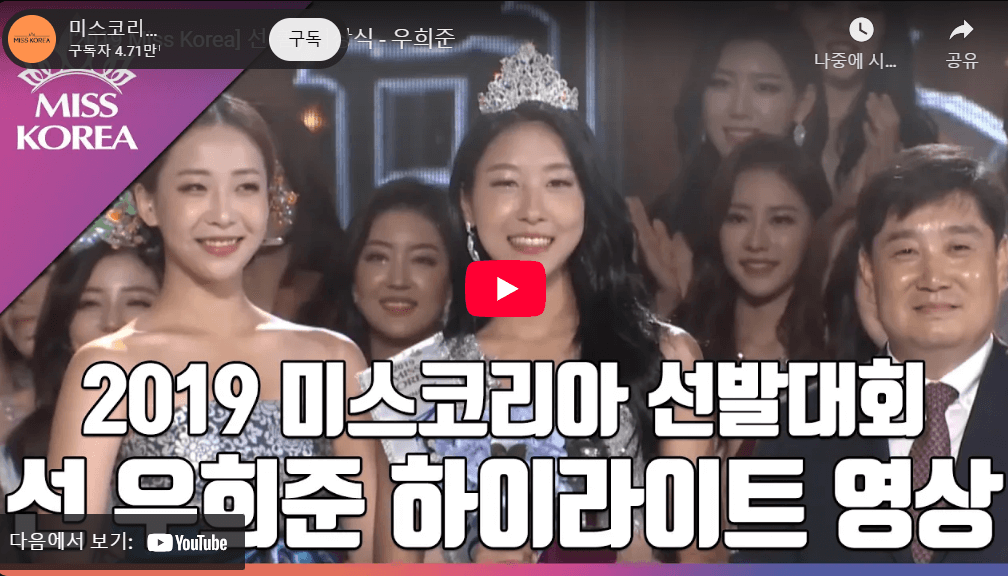 우희준 님은 울산대학교 재학시절 출전한 미스코리아 대회에서 미스 울산 부산 선으로 본선에 진출하여 2019 미스코리아 선(善) 에 선정되었어요.
