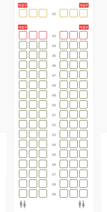 41열과 42열, 그리고 59열은 등받이를 젖힐 수가 없어 불편할 수 있는데요. 42열은 비상구 좌석으로 레그룸이 넓은 반면 등받이는 졎혀지지 않는다는 점에 유의하셔야 합니다.