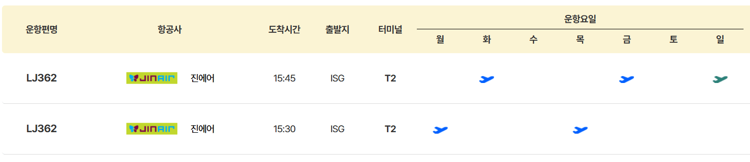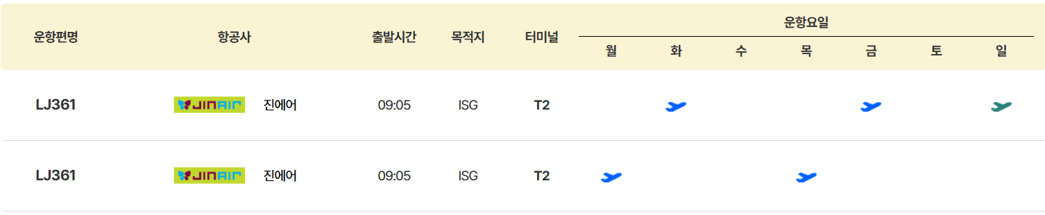 이시가키 공항에서는 인천 출국 편과 동일하게 매주 5회 (월, 화, 목, 금 일)에 직항편이 출발합니다. (진에어)