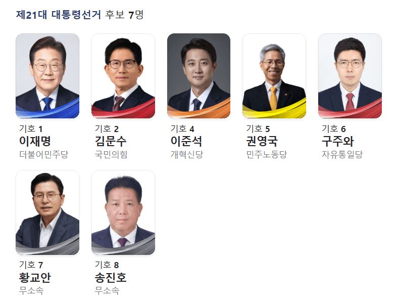 제21대 대통령 선거 후보자는 총 7명인데요. 조국혁신당은 대통령 후보를 내지 않았기 때문에 기호 3번은 공석이 되었어요.