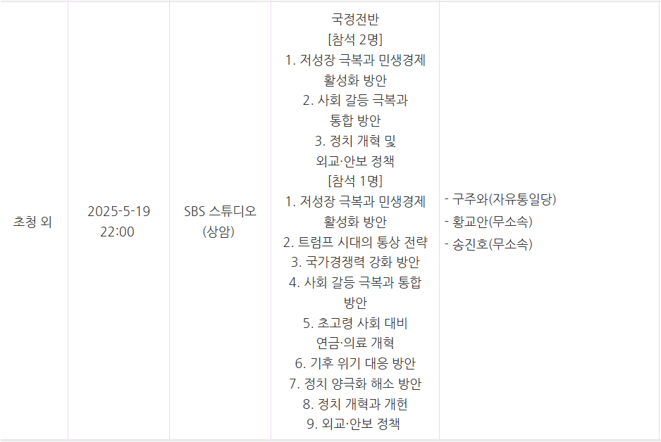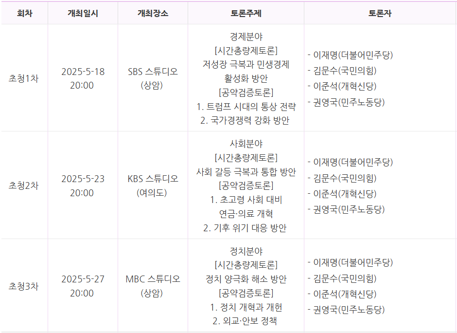 5월 18일, 23일, 27일에는 이재명 후보, 김문수 후보, 이준석 후보, 권영국 후보의 TV 초청 토론이 진행될 예정입니다.