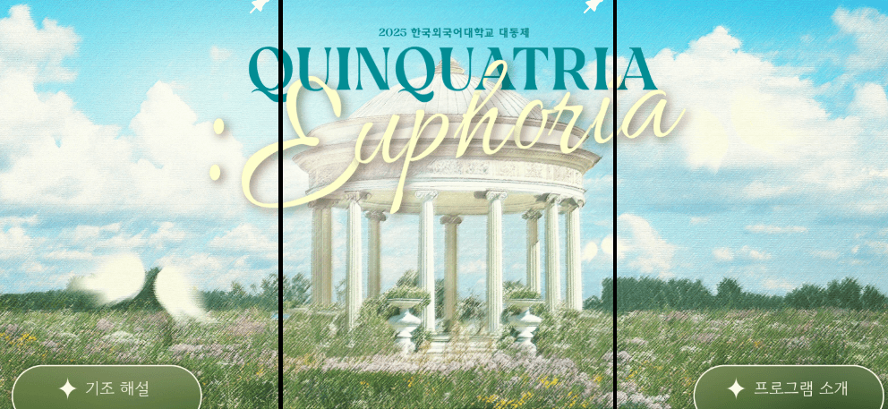 2025년 한국외대 축제 'QUINQUATRIA : Euphoria'는 여러분의 참여로 더욱 특별해질 거예요. 친구들과 함께 즐거운 추억을 만들고 새로운 인연을 만나는 소중한 시간이 되길 바랍니다.