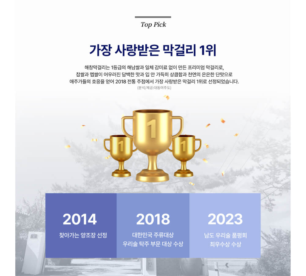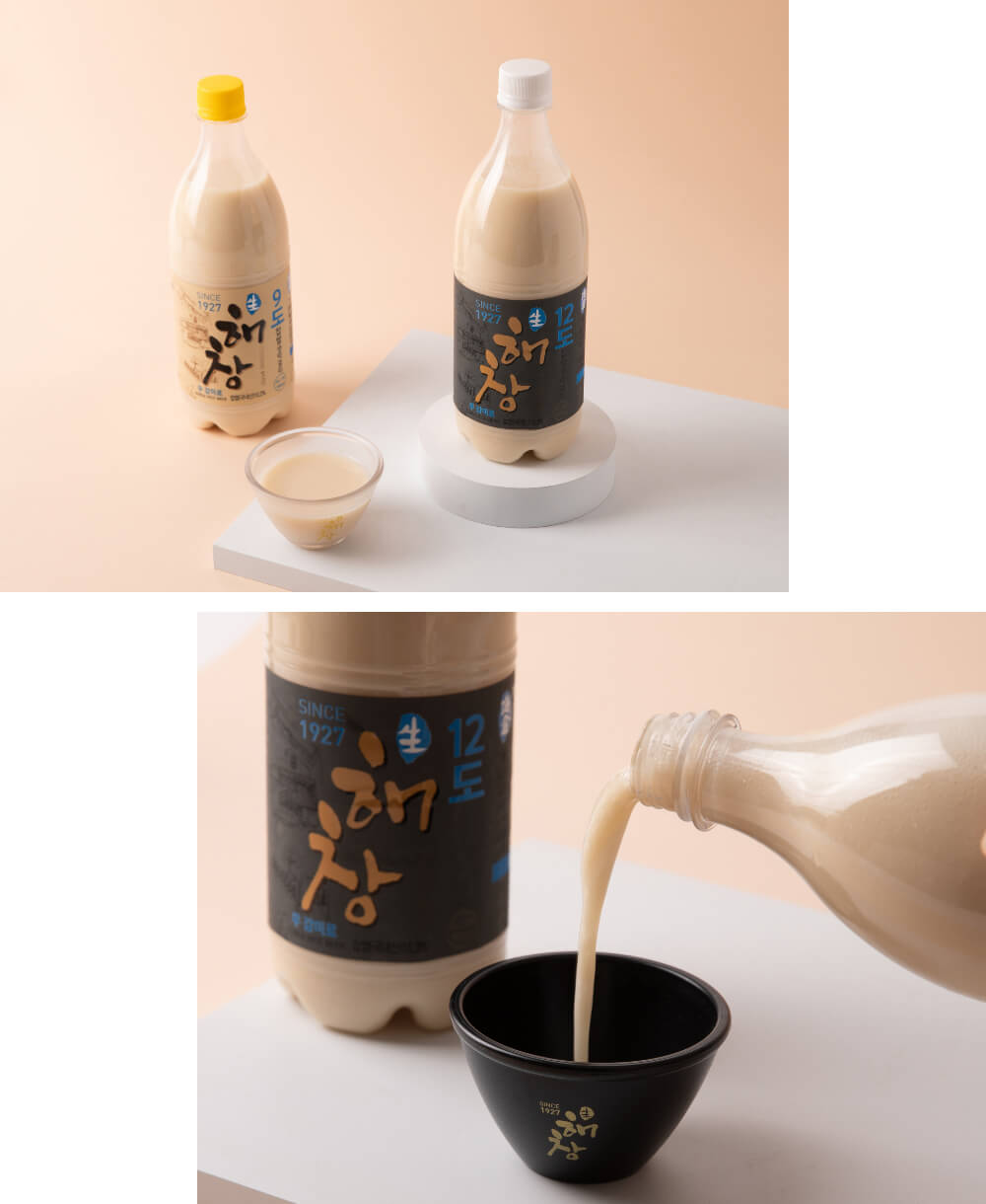 최상급의 국내산 맵쌀과 유기농 찹쌀로 고두밥을 지어 빚는 막걸리인데요. 도수에 따라 총 3개의 라인업(9도, 12도, 18도)을 구성하고 있으며 이 중 특히 해창 막걸리 18도는 원재료 본연의 담백함과 진한 바디감이 특징으로, 우리 술의 고급화에 앞장서고 있는 막걸리에요.