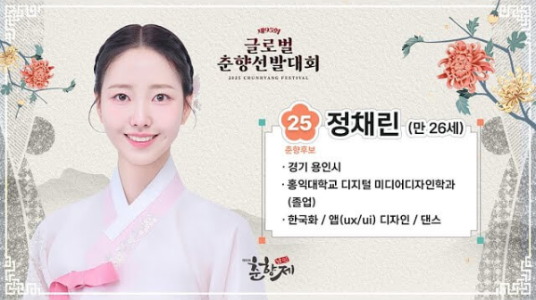 춘향 미는 홍익대학교 미디어디자인학과를 졸업한 정채린 양(만 26세)이 차지했어요.
