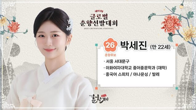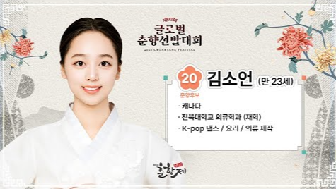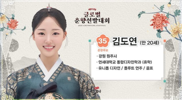 현재 연세대학교 통합디자인학과에 휴학 중이에요. 한복에 대한 깊은 애정과 디자인적 감각을 갖춘 그녀는 전통미와 현대적 감각을 두루 겸비한 참가자로 평가받으며 춘향 진의 영예를 안았어요. 김도연 양은 앞으로 춘향의 정신을 세계에 알리는 활동에 적극 나설 계획이라고 밝혔어요.
