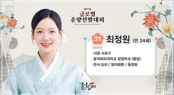 춘향 정에는 동덕여자대학교 경영학과를 졸업한 최정원 양(만 24세)이 선정되었어요.