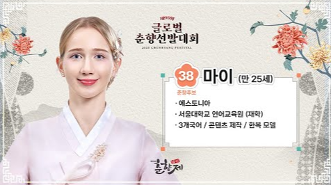 에스토니아 출신의 유튜버, 마이 양(만 25세)이 차지했어요. 미스 춘향 95년 역사 상 처음 수상한 외국인 참가자, 마이 양에 대해서는 아래 포스트에서 자세히 살펴보실 수 있습니다.