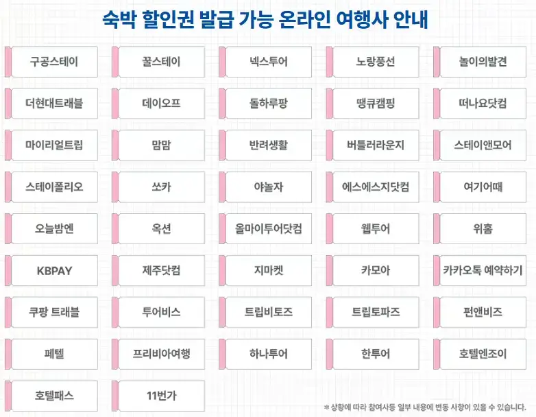 이쯤이면 숙박할인권은 어디서 받아야 하지? 궁금하실 텐데요. 아래 총 42개 온라인 여행사에서 발급받을 수 있어요.