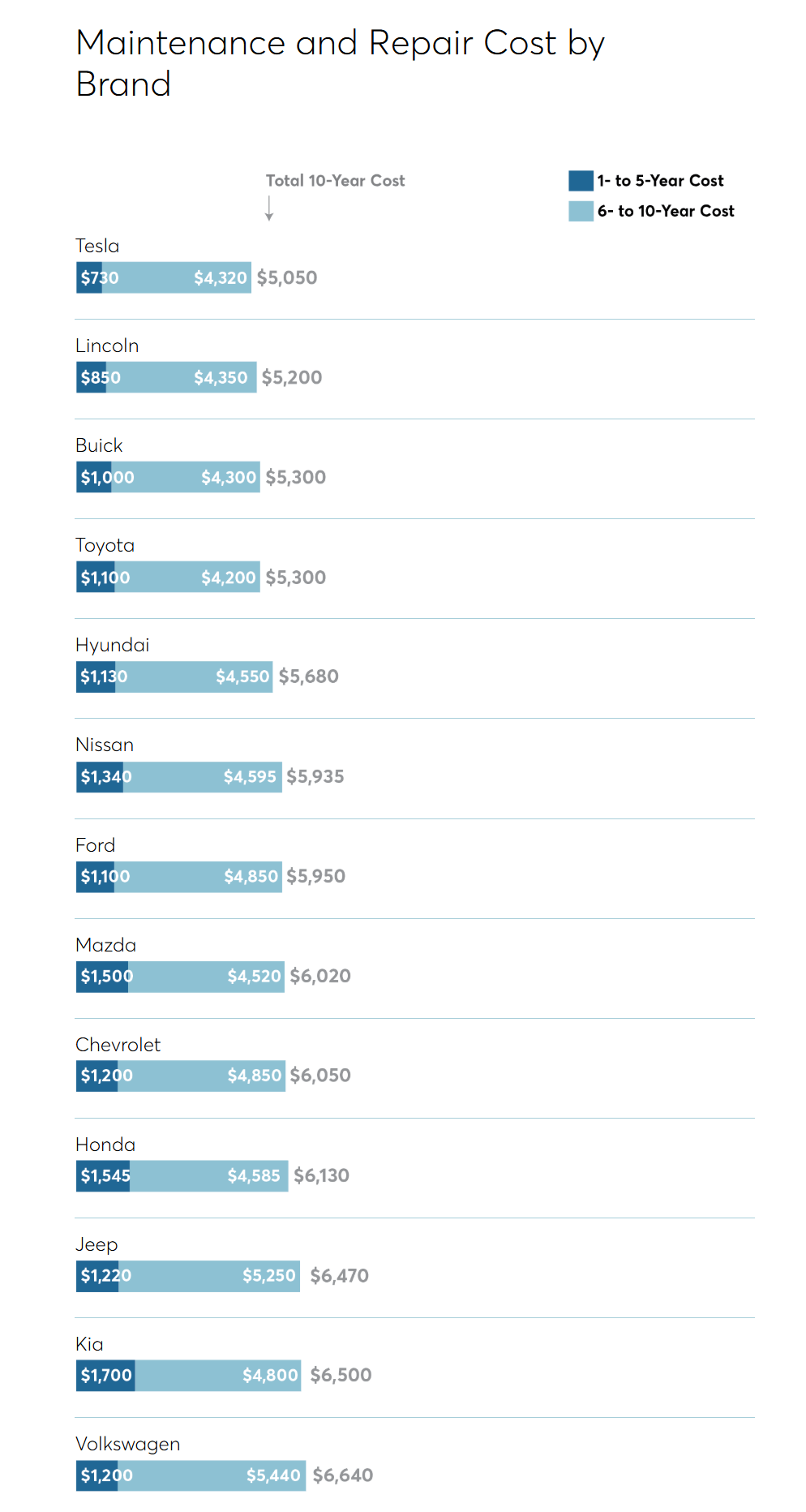 그 뒤를 잇는 브랜드는 링컨(Lincoln), 뷰익(Buick), 토요타(Toyota) 순인데요. 각각 10년간 평균 유지비가 $5,200 (약 700만원) ~ $5,300 (약 720만원) 수준으로 비교적 부담이 적은 편이에요.