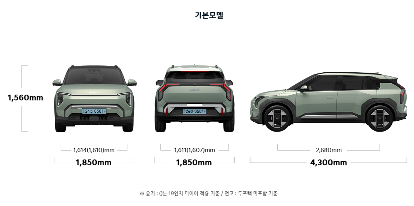 • 기본 모델: 전장 4,300mm, 전폭 1,850mm, 전고 1,560mm, 휠베이스 2,680mm 입니다.
